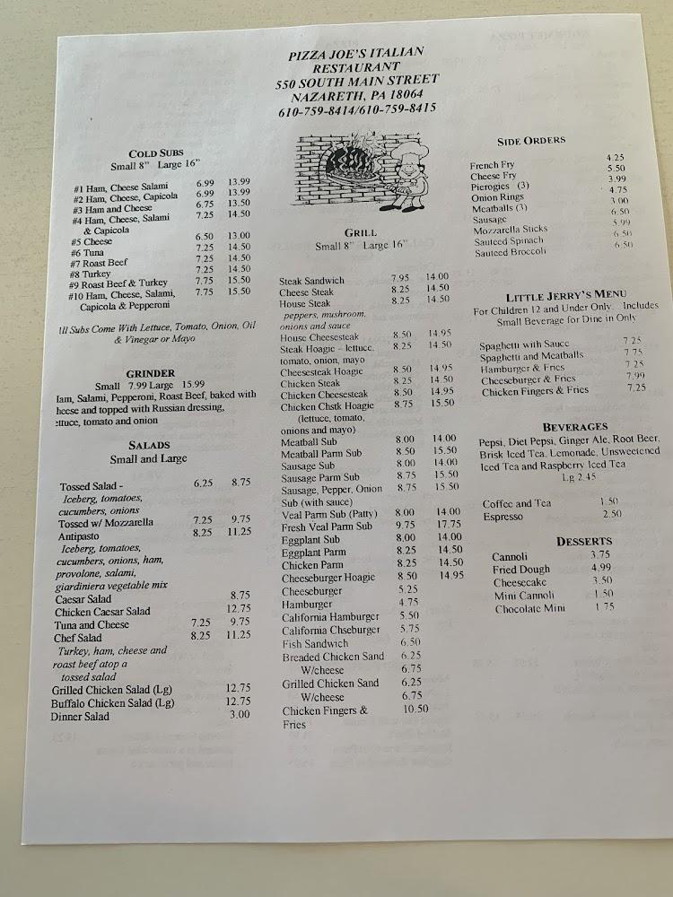 Welcome to Pizza Joe's Italian Restaurant, your go-to destination for delicious, homemade Italian cuisine in Nazareth, PA. Our casual, family-friendly atmosphere makes it the perfect spot to enjoy generous portions of mouthwatering pizzas, calzones, strombolies, and an array of pasta, seafood, chicken, and veal dishes. With a price range of $10 to $20, we offer great value without compromising on quality. Whether you're dining in or taking out, our commitment to friendly service and local specialties ensures a memorable experience for solo diners and families alike. Join us today at 550 S Main St for a taste of Italy!
